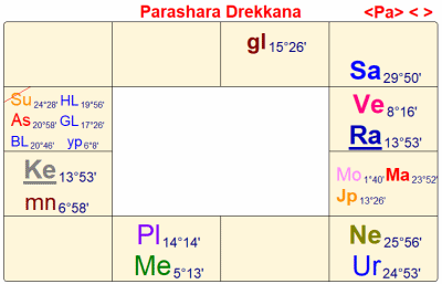 生前墓の購入は、将来についてのやや過剰な心配を反映しているように思えるが、それはおそらく金星や4室支配の水星にラーフがコンジャンクトしている為である。