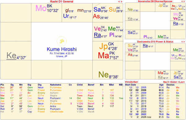 またプラティアンタルダシャーのラーフは8室に在住して、結婚願望が高まる時期であり、久米宏に妻との離婚を迫っていったというのは、この配置の為である。