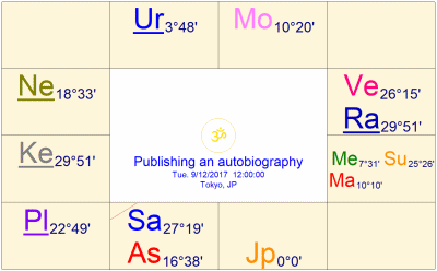 2017年9月12日は、木星/太陽/ラーフ期であるが、木星は、月から見て9室支配で5室に在住し、太陽は月から見た5室の支配星で、ラーフは5室の支配星とコンジャンクトしている。