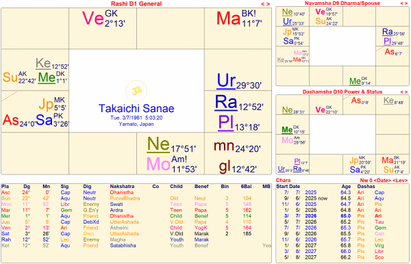 山羊座ラグナであるという前提での話だが、高市早苗は、当選した現在、チャラダシャーでは、牡羊座/水瓶座の時期で、牡羊座から見て、11室にAmKがアスペクトし、また牡羊座から見て、10室で、10室支配の土星がシャシャヨーガを形成し、9-10、9-11のラージャヨーガダナヨーガを形成している。