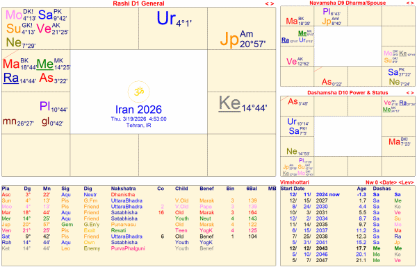 2026年のイランの新月図を見ると、ラグナが水瓶座であり、そこにラーフ、火星、水星が惑星集中し、木星が双子座からアスペクトしている。