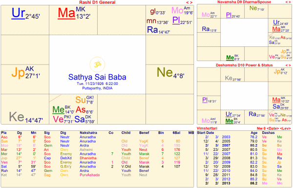 サティア・サイババは、アストロデータバンクの6:22という出生時間を用いると、蠍座ラグナで、蠍座惑星集中である為、教師や師匠と見なす存在なのである。