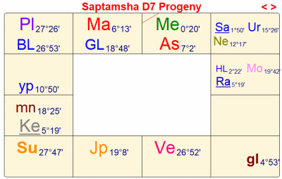 またダシャーは、火星/水星/火星で、火星は5室支配の木星からアスペクトされており、水星は月から見て9室に在住し、ディスポジターの木星は5室の支配星で、表示体の木星から見た9室の支配星でもある。