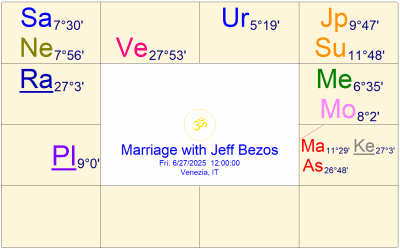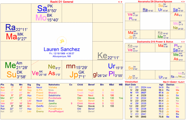 ローレン・サンチェスの狂暴性は、4室と6室の星座交換にあり、6室で4室支配の土星が減衰する配置は、パラシャラの例外則であり、ニーチャバンガラージャヨーガでもあるが、敵を粉砕する配置であり、資産家を破産に追い込み、不動産を強奪したのは、この配置の強さの為である。
