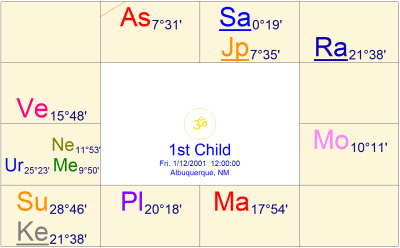 2001年2月12日に第1子を出産しているが、トランジットを見ると、少なくとも1か月前の時点で、土星と木星が牡牛座で逆行し、5室支配の木星にアスペクトして5室にダブルトランジットしており、また火星も5室支配の木星をトランジットしている。