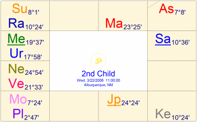 第2子出産は、2006年6月22日で、少なくとも3か月前の時点で、土星は蟹座で逆行して、5室にアスペクトし、木星は天秤座で5室支配の木星にリターンして、5室にダブルトランジットを形成していた。