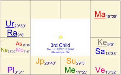 最後に第3子は、2008年1月15日に出産しており、少なくとも2ヵ月前の時点で、木星はラグナから5室にアスペクトし、土星は獅子座から5室支配の木星にアスペクトして、5室にダブルトランジットが形成されていた。