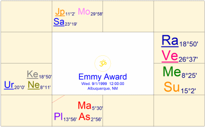1998年4月~1999年9月は、月/水星期で、マハダシャーの月は、月ラグナから見た1ー11の星座交換に含まれており、アンタルダシャーの水星は、8、11室の支配星で、8室にアスペクトバックして強く、このタイミングで、賞を受賞したことが分かる。