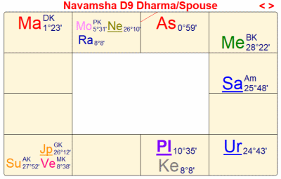 太陽には1,4室支配の木星がアスペクトして、1-9,4-9のラージャヨーガを形成しているが、木星はオールラウンドプレーヤーであり、あらゆる学問において、博識にさせる配置である。