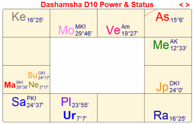 ダシャムシャでも8、9室支配の土星が7室で射手座に在住し、7-9のラージャヨーガが形成されており、年配の県議などからの支援を受けながら、出世してきたのである。