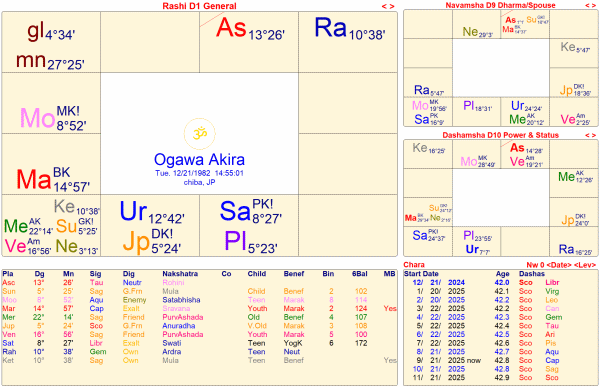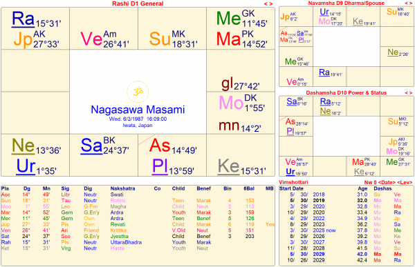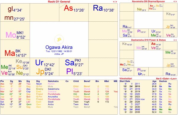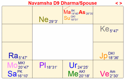 しかも7室の金星は、カラカ・バーバ・ナシュヤ(表示体・ハウス・破壊)であり、パートナーにとって良くない配置と言われるが、パートナーとの間に過剰なロマンスを求める配置である。