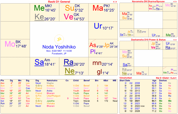 野田佳彦は、ケンドラの4室に土星が在住して、3、10室支配の金星、ラグナロードの太陽、5,8室支配の木星、2,11室支配の水星を激しく傷つけている。