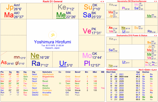 私は吉村洋文氏のラグナを射手座ラグナに修正したが、2023年8月からマハダシャー土星期に移行している。
