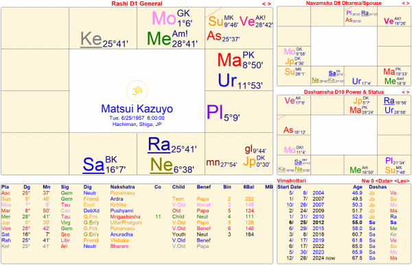 この時がラーフ/火星期から木星/木星期への移行期であり、火星は6、11室の支配星で、2室で減衰して、パラシャラの例外則によるラージャヨーガ的な効果をもたらすが、6室の支配星が減衰することで、敵を粉砕するという象意となり、また2-11のダナヨーガなども形成されており、裁判で勝訴して、清水建設からおそらく、巨額の賠償金を勝ち取ったと考えられる。