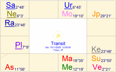 この水星は蟹座のプシュヤに在住しており、土星のナクシャトラに在住することで、土星の影響を強く受けている。