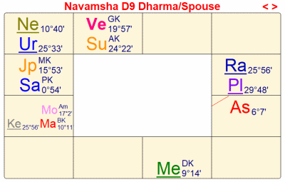 ナヴァムシャのラグナが獅子座であれば、土星と木星は7室に在住し、結婚を表しているが、乙女座ラグナでは離婚の6室に位置することになる。