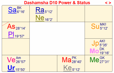 太陽はダシャムシャにおいて、7室支配で6室に在住し、月は6室の支配星で、7室に在住しており、6-7の星座交換をしており、月は、11室支配の木星とコンジャンクトしている。