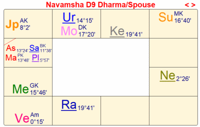 因みにシャシティアムシャ(D60)は、出生図、ナヴァムシャよりも場合によっては重要な分割図で、出生図と同じように全ての事柄を見ることが出来るが、シャシティアムシャでは、月は5室の支配星で、7室支配の水星と相互アスペクトし、火星は結婚生活の2室の支配星で、月ラグナから見たラグナロードであった。