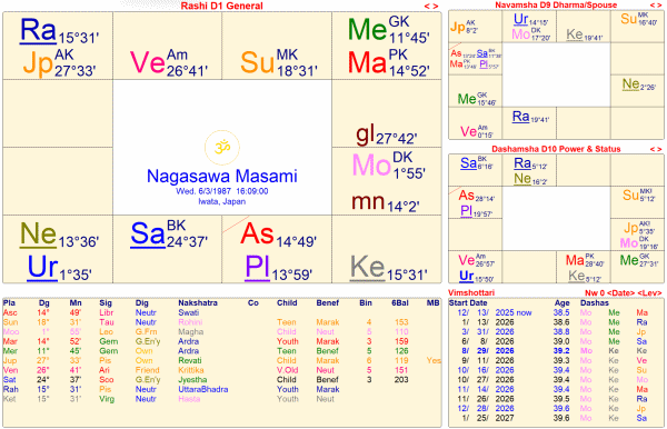 但し、この月はナヴァムシャにおいて6室の支配星で3室に在住している為、何故、このタイミングで結婚したのか不可解な所がある。