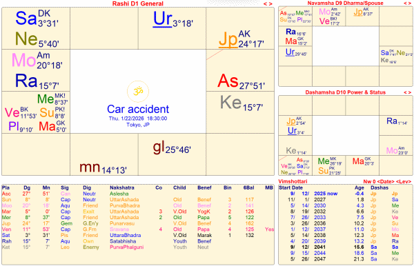 ラーフ/ケートゥ軸は、6-12軸に在住して、事故の6室に絡み、土星が6室に在住し、火星が12室から6室にアスペクトして、6室を激しく傷つけている。