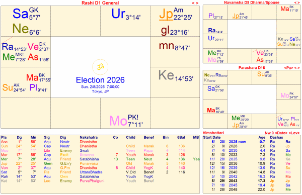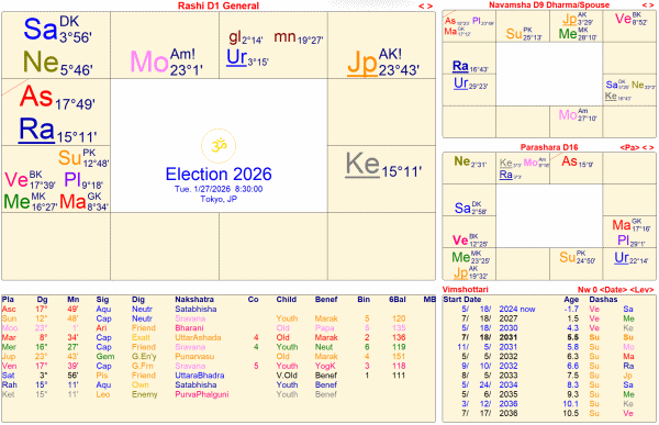 今回の2026年衆議院議員選挙の公示日は、2026年1月27日8:30 各都道府県の選挙管理委員会の窓口であり、各候補者の立候補が受理されて、選挙活動がスタートするが、山羊座ラグナで、12室に太陽、金星、水星、火星が惑星集中している。