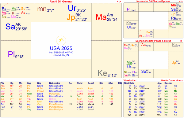 アメリカの2025年の新月図は、ラグナに惑星集中して7室にアスペクトし、ラーフ/ケートゥ軸も1-7軸に在住して、戦争の7室が強調されていた。