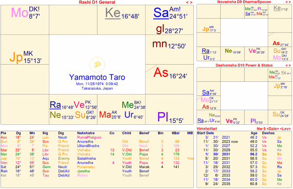 但し、土星はシャシャヨーガも形成している為、その効果が、党代表への就任につながったとも考えられ、土星期は、吉凶混合した象意を示している。